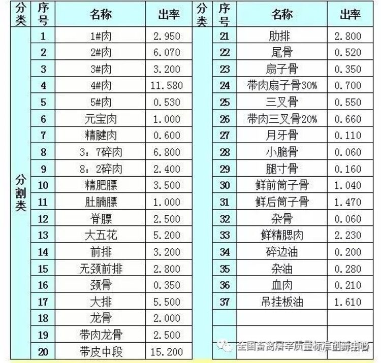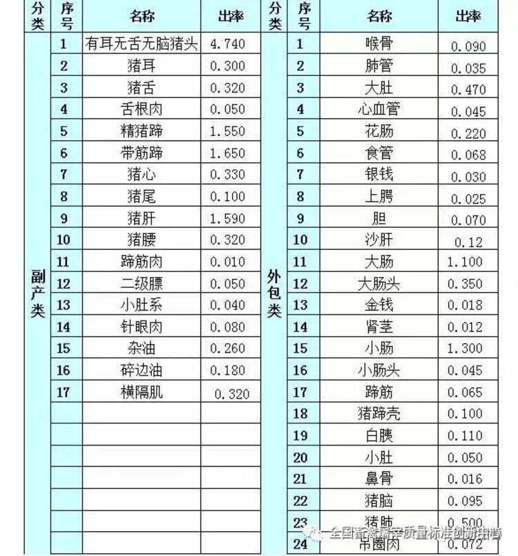 猪产品出率参考标准汇总表(单位:KG/头)
